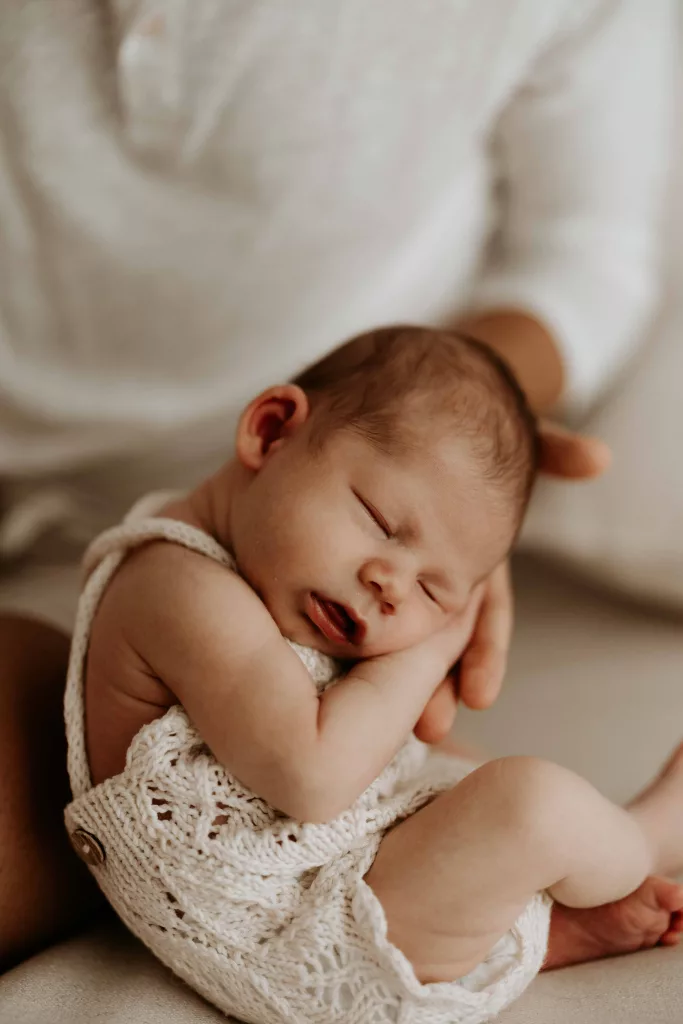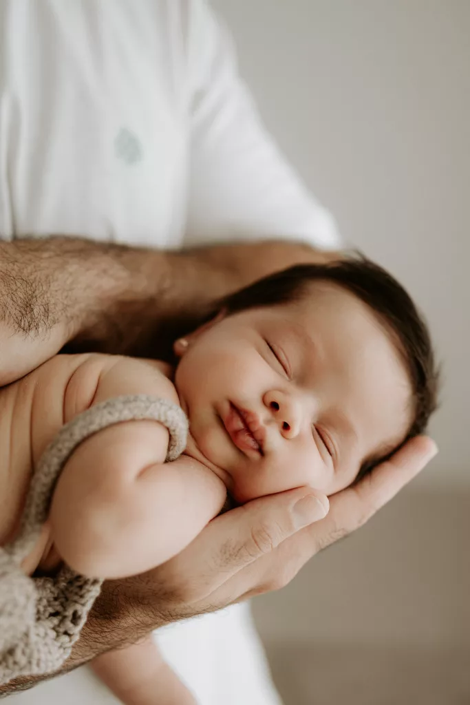 La sesión se realiza durante los primeros 15 días de vida, cuando el bebé todavía mantiene ese sueño profundo y posición fetal que nos permite realizar las fotos con total calma.